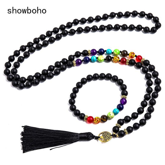 8mm Matte Black Onyx 7 Chakra Beaded Knotted 108 Mala Necklace