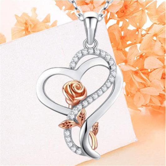Luxurious Zircon Rose Heart Necklace | Fashion Double-Layer Long Chain Wedding Pendant | Beautiful Sterling Silver Rose Necklace