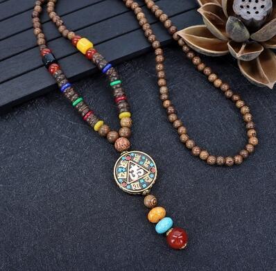 Vintage Nepal Long Buddhist Mala Wood Beaded Pendant & Necklace Ethnic Bohemian Boho Elephant Buddha Lucky Jewelry for Women Men